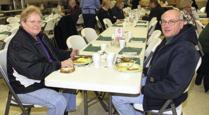 PRESS PHOTOS BY LINDA ROTHROCK Getting out of the cold and enjoying a nice warm breakfast are Mimi and Joe Simmons of Ironton. The fellowship hall at the Assumption BVM Church, Northampton, was full the morning of Jan. 26 as parishioners and community families enjoyed an all-you-can-eat breakfast of eggs, hash browns, sausage, bacon, refreshments and desserts.