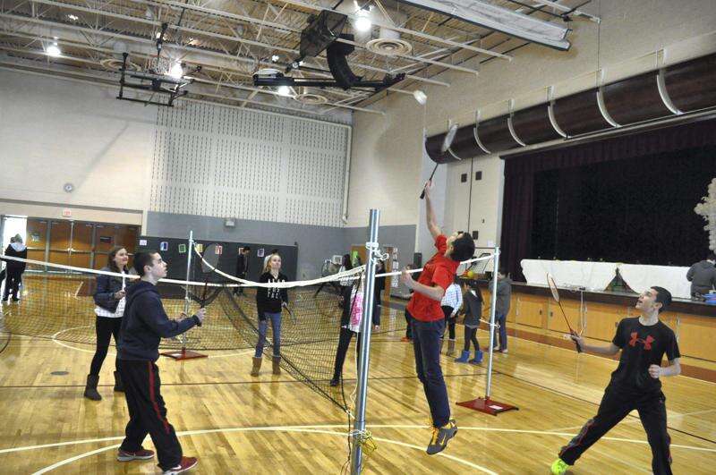 St. Thomas More seventh grader Izzy Martino leaps for the shuttlecock during a game of FourSquare badminton during student appreciation day activities celebrating Catholic Schools Week at the school. FourSquare is an active elimination game and was among several activities enjoyed in the school gym Jan. 28.