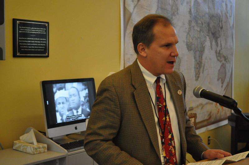 Swain Middle School history teacher Chris Burns presented a slide show highlighting now-famous events in King's leadership of the African-American Civil Rights Movement of the 1960s.