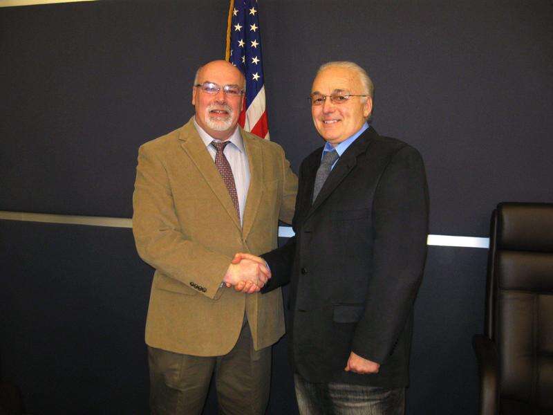 PRESS PHOTO BY PAUL CMIL Chairman Bruce Paulus, right, congratulates John Martucci after his swearing in ceremony.