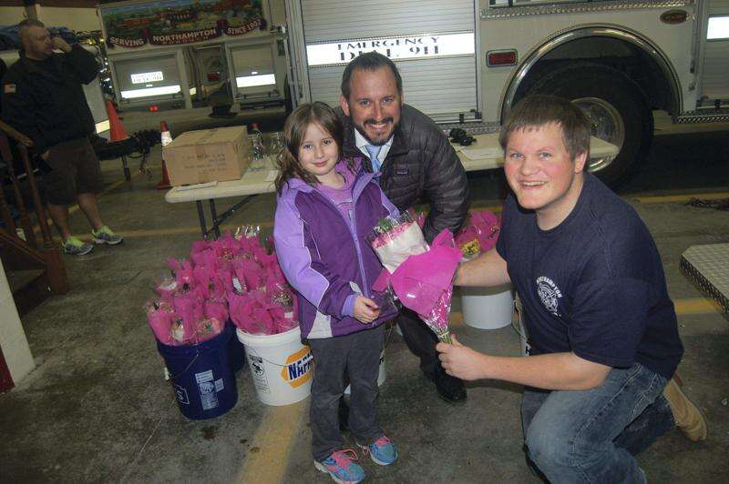 PRESS PHOTOS BY AL RECKER AND MARK RECCEK Craig Rogan and his daughter Caitlyn, of Northampton, select a beautiful bouqet of roses for Rogan's wife, Rita, last Wednesday at the Northampton Fire Department on Lerchenmiller Drive. Handing over the roses is borough firefighter Dylan Archer. This year marks the first year the borough fire department held a Valentine's Day rose sale.