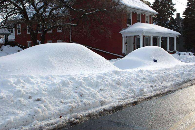 Frequent snow storms have completely encased some vehicles parked on borough streets, some of which, it seems, may not be released from their winter hibernation until spring. These two were sited on Bridge Street Saturday.