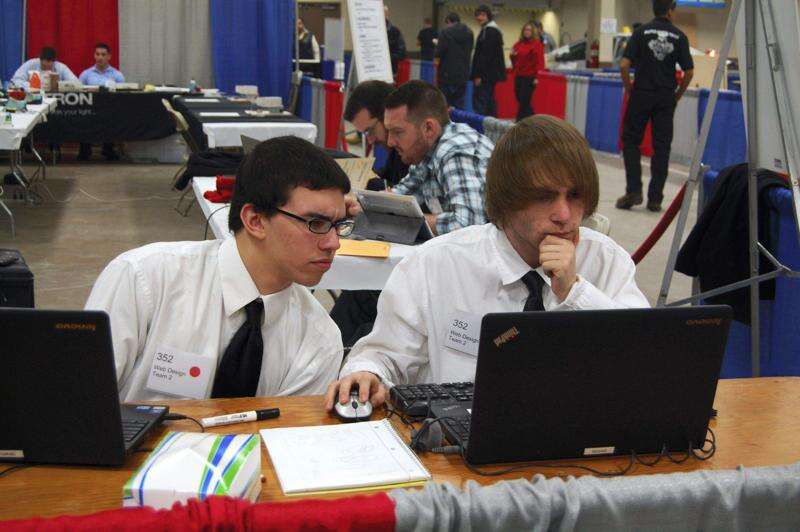 PRESS PHOTO BY SUSAN BRYANT Jason Nemesch of Salisbury High School and Joshua Weaver of Catasauqua High School competed together in a web design team competition at the district-level SkillsUSA Showcase of Skills. The students, who attend Lehigh Career & Technical Institute, were awarded second-place silver medals.