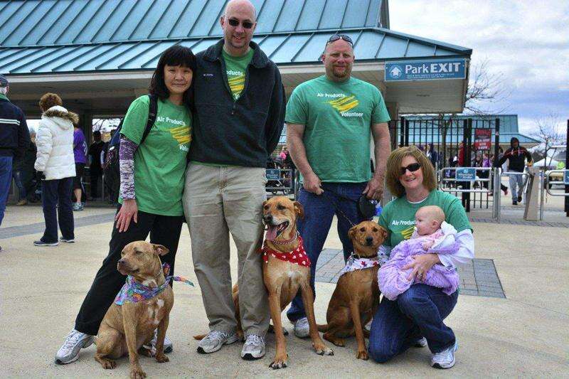 Representing Air Products are Annie Ramsey with 'Mocha;' Scott Ramsey holding 'Mira;' Kip Kibler holding 'Si;' and Mary and Kacey Kibler April 27 at the March of Dimes walk at Dorney Park, South Whitehall Township.