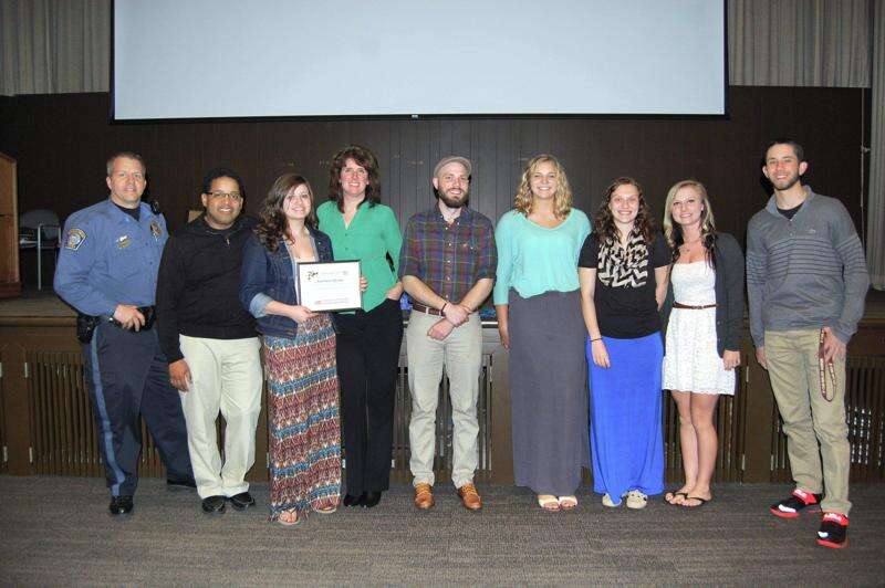 Bethlehem Township Police Officer Dean Wilson and Student's Against Destructive Decisions video contest judges Mike Kelly and Stephanie Wells, co-hosts for B-104 "Mike and Steph in the Morning" show and C.J. Matz, celebrate with Catasauqua High School students Abigail Wolfe, Shea O'Brien, Rachel Sell, Michaela Waldropl and Tyler Correll, who won second place at the SADD Video contest and award ceremony held April 11 at the Lehigh Valley Health Network Auditorium, Allentown. Students created short videos opposing drunk driving, texting while driving and other safety issues for teens.