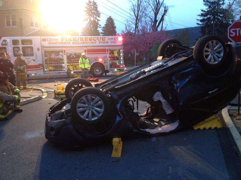 PRESS PHOTOS BY KYLE MERTL The crash, at the intersection of Bishop Thorpe and Ostrum streets occurred May 3. When fire personnel arrived, they found an SUV on its roof with two people still inside.