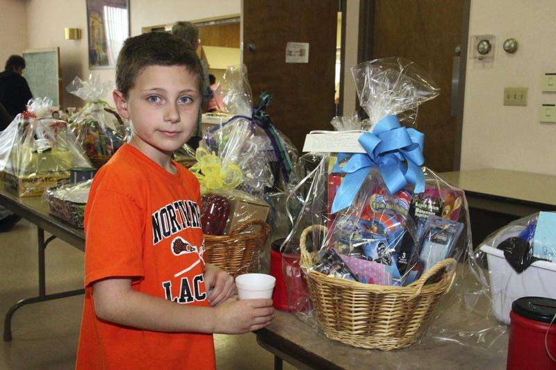 PRESS PHOTOS BY LINDA ROTHROCK The Max Steele basket catches the eye of Brayden Eckhart of Walnutport during the Christ United Church of Christ, Danielsville, spring basket social held May 2 in the fellowship hall of the church. Brayden was at the basket social with his parents.