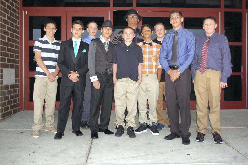 From left, Catasauqua Middle School students Jashon Boyko, Oscar Cordon, Derrick Rodriguez, Anthony Stahl, James Guillen, Shane Brader and Xavier Fryslin; and in the back row, Austin Gorr, Tyler Patterson, and Ryan Stuber show up at the middle school Eighth-Grade Celebration Dance as a group. The annual, end-of-year dance for eighth graders was held Friday. See additional photos on page A7. PRESS PHOTOS BY MARK RECCEK