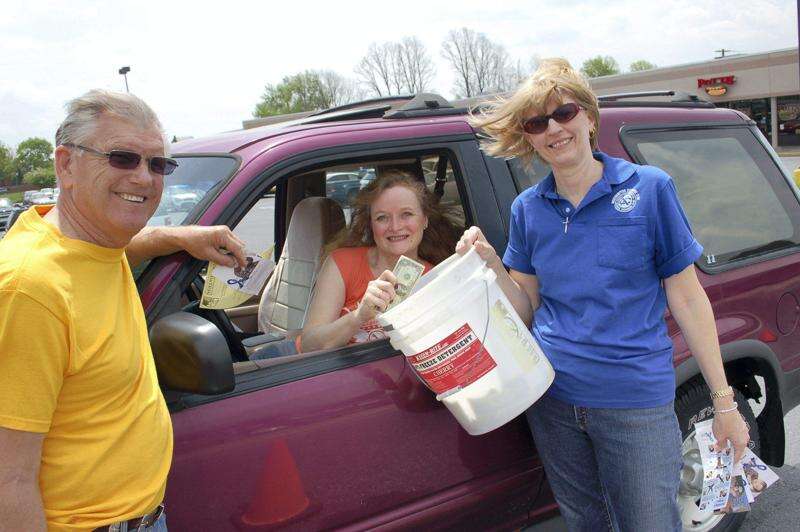 Roselle Zastko of Northampton was one of many drivers who stopped on Held Drive last Saturday to donate money to the Northampton Exchange Club. From left, volunteers Robin Lutz and Jack Harhart assist with the club's annual Help Protect Child Abuse Campaign.