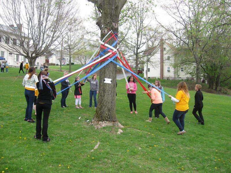 "The Maypole Dance is a tradition in European nations that was brought over here with the Pilgrims," she said. The dance is a choreographed round with alternate participants going one way and their counterparts going the other. The end result is the ribbons originally draped from the tree trunk now embrace the tree in a woven pattern.