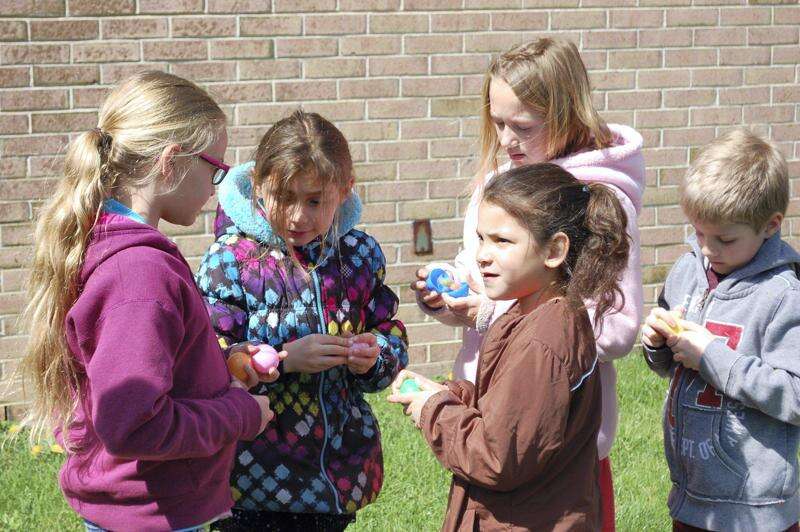 PRESS PHOTOS BY MARK RECCEK From left, Abigail Peartree, Shelby MacHose, Titiana Rodriguez, Leeya Millen and Zachary Bear inspect the eggs they captured during the annual Sheckler Elementary School Easter egg hunt held last month.