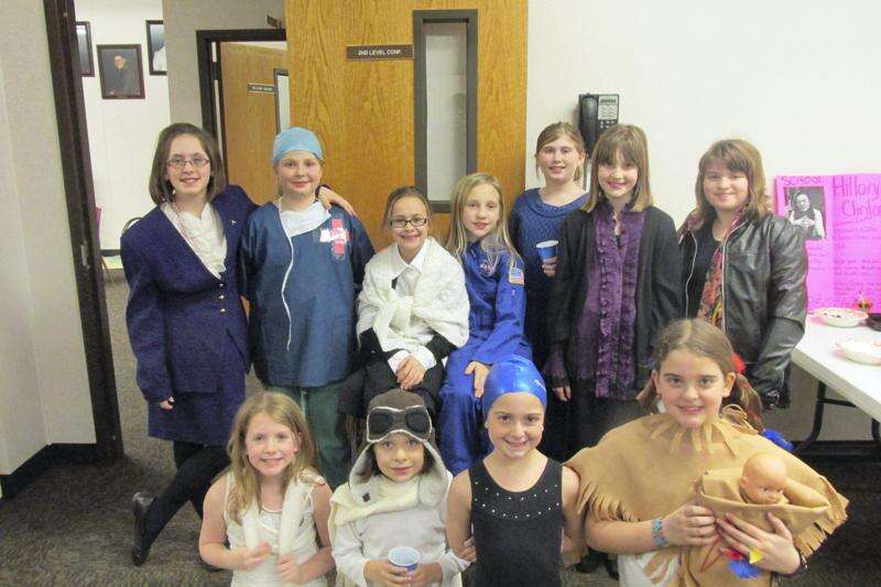 PRESS PHOTOS BY LINDA ROTHROCK From left, front row, Girl Scouts Maggie Doyle (Grace Kelly), Skye Spadaccia (Amelia Earhart), Casie Brooks (Gertrude Ederle), Alex Stepp (Sacagawea); and in the back row, from left, Logan Rhoades (Hillary Clinton), Charlotte Vinson (Frances Slanger), Lauren Straub (Martha Washington), Emily Roehler (Sally Ride), Keira Ettinger (Laura Ingalls Wilder), Laci Shupp (Helen Keller) and Bethany Gable (Amelia Erahart). Recently, junior Troop 8635 hosted a History Party at Hope