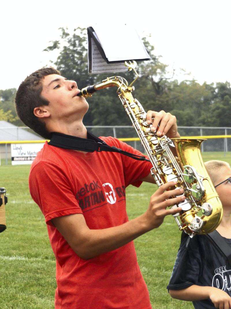 PRESS PHOTOS BY LINDA DEIBERT Robbie Leiser plays saxophone during rehearsal.