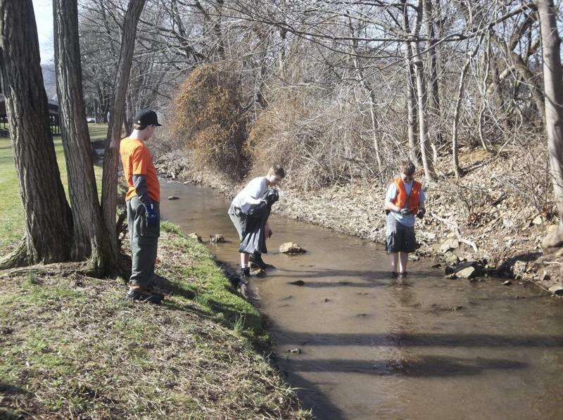 Boys walked on both the banks and in the water of the creek picking up any litter and trash they found along the way. The Troop is sponsored by Solomon's United Church of Christ. ABOVE: Jacob Goldstein, Ian Morrin and David Roscillo walk through the creek picking up trash to bag and remove.
