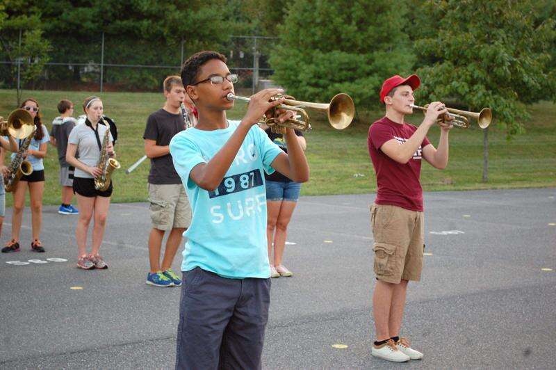 PRESS PHOTOS BY MARK RECCEK Catasauqua High School Roughies Marching Band members Jhosbel Polanco, left, and Evan Deitrich display their musical talent on the trumpet during a recent band practice held at the high school parking lot.