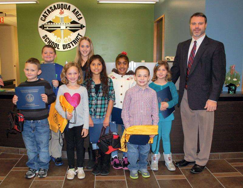 Sheckler Elementary School November Students of the Month were recognized at the Catasauqua Area School Board's Dec. 4 meeting. In the front row, from left, are Ethyn Vakoc, Lilian Delabar, Victoria Villalta and Kevin McGaughran and, in back, are Dylan Carfara, Cora Soltis, Aseret Bell and Maryellen Schlegel. Also pictured with the students is Sheckler Principal Eric Dauberman.