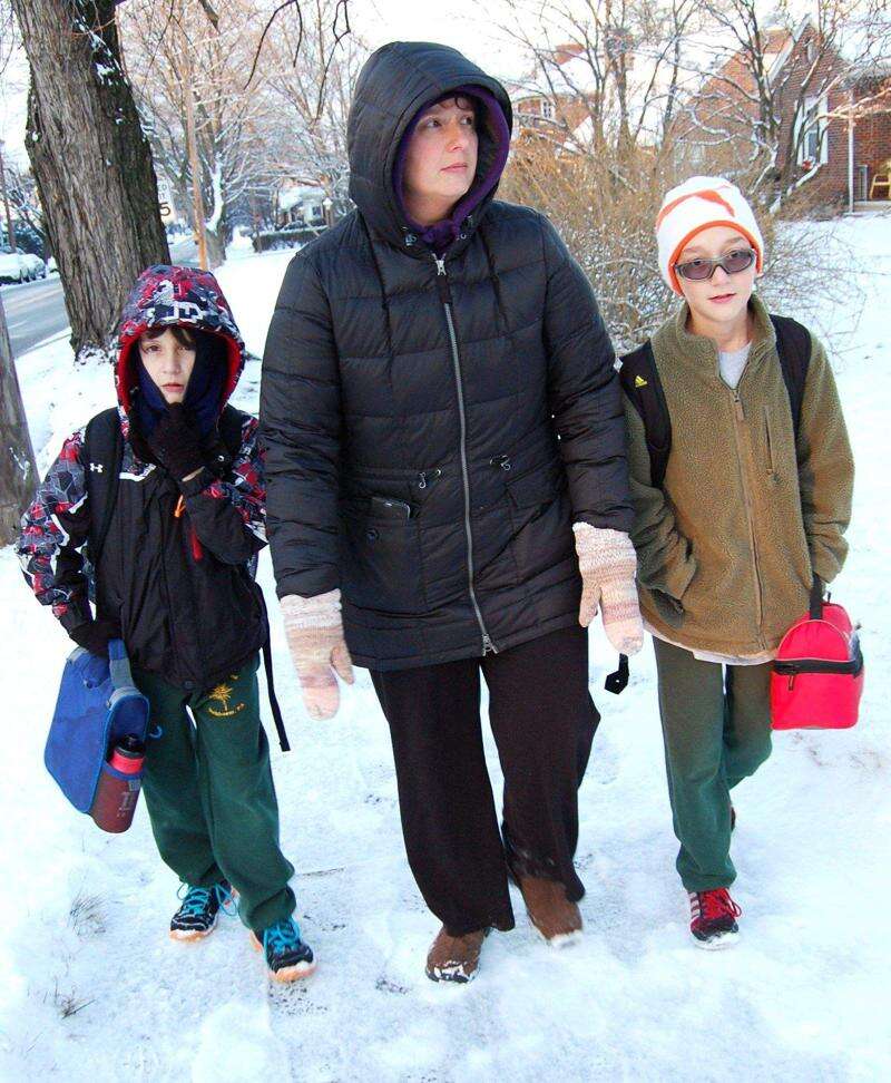 PRESS PHOTOS BY TIM GILMAN Marci Sledz walks her two children Daniel and Jacob along Washington Avenue toward nearby St. Anne School the day after the first 2015 snowfall. Bitter cold temperatures did not deter Sledz from her customary walk with her children.