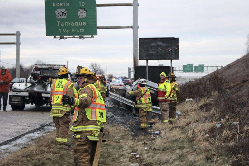 Firefighters from Western Salisbury Fire Department, along with an EMS unit from Cetronia ambulance, respond to a reported vehicle accident on Interstate 78 westbound just past the Hamilton Boulevard exit 7:30 a.m. Jan. 19. The driver of the vehicle lost control of the vehicle and drove up, on and over the guardrail. The driver was able to get out of the vehicle before emergency service personnel arrived. Interstate 78 traffic was backed up for several miles while crews worked to remove the vehicle. LEFT: Firefighters prepare a hose line as a precaution as cleanup crews work to remove the vehicle off the guardrail.