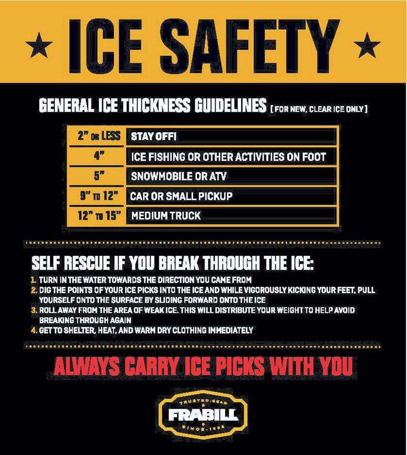 Experienced ice anglers know that ice conditions on any lake can vary from location to location. The places to be extra careful around or avoid is moving water from feeder streams, rivers and springs that can cause ice to form unevenly. The consensus is that it's truly up to anglers to learn the ice conditions from other ice fishers, snowmobilers, fishing clubs or bait shops around the area of the waters.