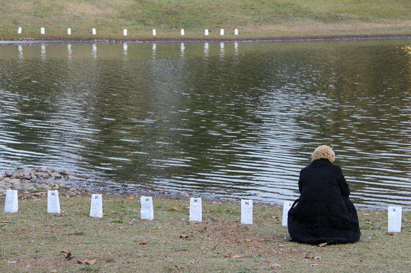 PRESS PHOTOS BY JOSH LEDERMAN St. Luke's Hospice sponsored a luminaria walk and lighting ceremony Nov. 8 in remembrance of loved ones who have passed. The walk was held outside the offices of the Visiting Nurses Association of St. Luke's in Bethlehem. St. Luke's Hospice's Spiritual and Bereavement Care manager, Rev. Anne Huey, spoke briefly to the participants before the lighting. Above: Director of Hospice Linda Moller lights candles before the luminaria walk.