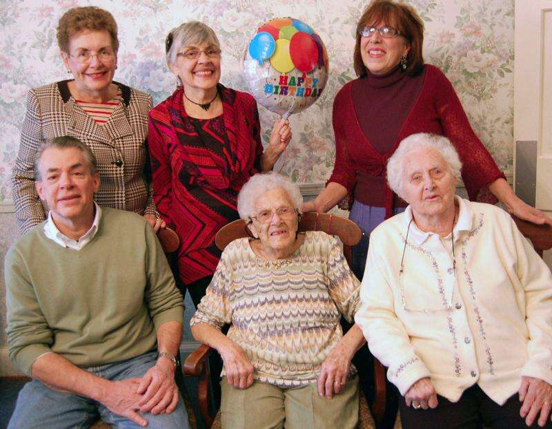 Press Photo by Tim Gilman Centenarian Gertrude Smull, a Bethlehem native and current resident at the King's Daughters Home in downtown Bethlehem, is surrounded by immediate family for a photo session during her recent birthday party. Sitting next to Gertude are her son Tom Smull of Bethlehem and her oldest sister Betty Sterrett, 97, from Cape Cod. Standing behind the birthday celebrant are her three daughters: Louise Smull Negley, of Maine; Maggie Smull Hopper from South Carolina; and Mary Smull Arguelles,