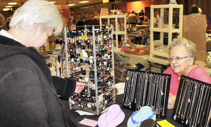 PRESS PHOTOS BY TINAMARIE MARTIN Debbie Kroninger of Bethlehem admires handcrafted jewelry by Karen Tressler at the Klecknersville Rangers Volunteer Fire Company flea market Jan. 4. 'I have been a vendor for ten years,' said Tressler. 'It is a tradition.'