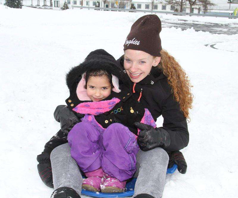 PRESS PHOTOS BY LINDA ROTHROCK Above: Ready to do some sledding at the 3-dips at the Catasauqua Park are Amani Dougherty and her mom, Molly, of Catasauqua. Left: Keira Bishop, right, and her parents, Jeffrey Bishop and Rose Panetta, had some fun in the snow in front of their house in North Catasauqua last weekend. Saturday's wet snowfall provided perfect packing and sculpting material for a very fine Frosty.