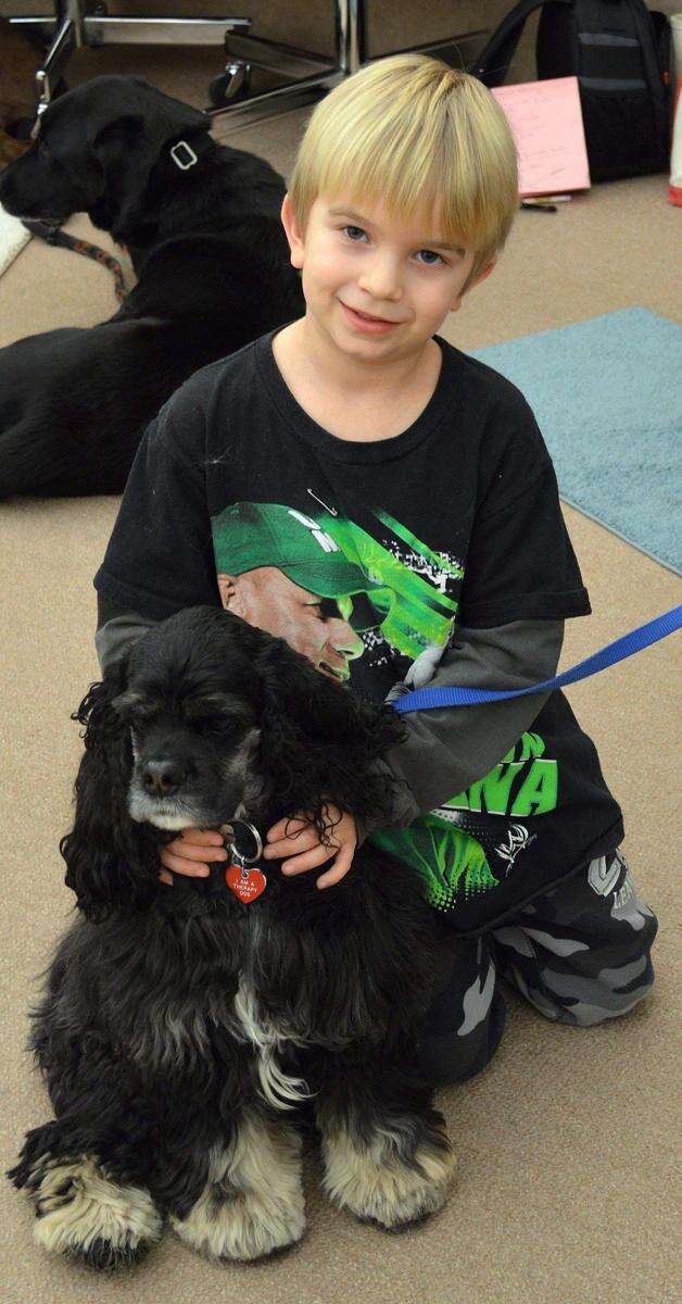 PRESS PHOTOS BY BEVERLY SPRINGER Carter Smith and Piper take a reading break at the Books and Barks program at the Emmaus Public Library Jan. 21.