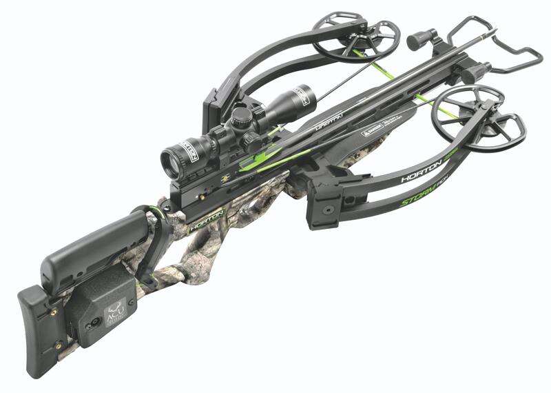 Horton's new crossbow, named Storm RDX, is a reverse limb draw bow that has a speed of 370 fps with a 400-grain bolt, weighs 7.7 pounds and has a 10-inch axle-axle width when cocked. It's hard-hitting with 122 ft/lbs of kinetic energy and comes with an intact cranking mechanism that 10-Point uses on some of their other crossbows.