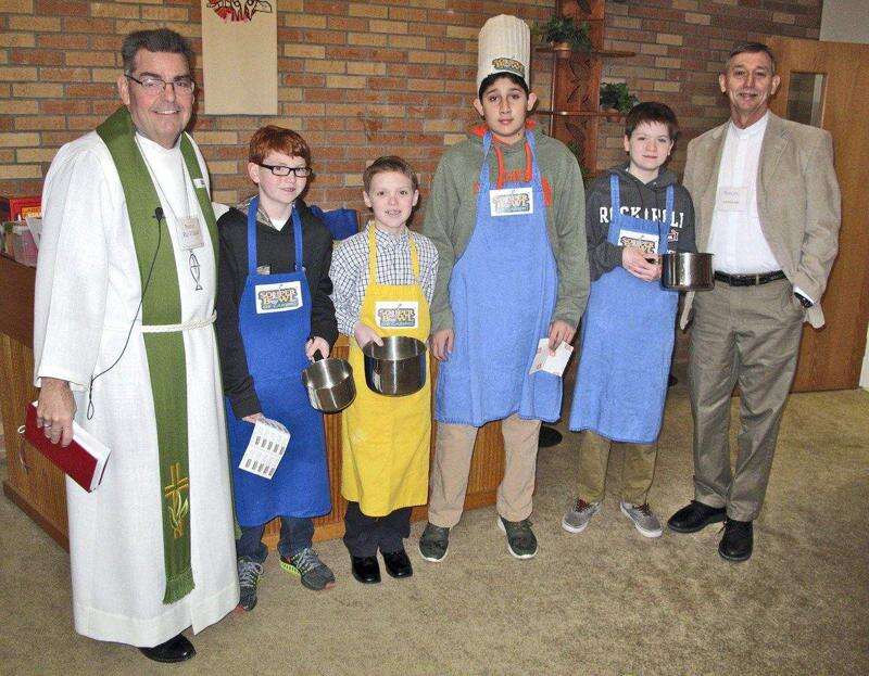 The catechism class collected monetary donations Feb. 1 throughout the morning at The Lutheran Church of the Holy Spirit as part of a national organization Super Bowl of Caring encouraging local churches to collect money for local food pantries. ABOVE: Rev. Richard Elliott, Connor McCormick, Ben Kahler, Evan Bhagat, Eric Grazio and Rev. Jim Bowers stop for a photo after collecting donations.