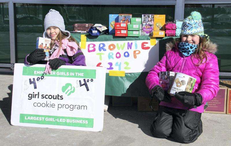 PRESS PHOTOS BY LINDA ROTHROCK Braving the cold weather Jan. 31 to sell cookies outside the Pets Supply Plus store in Whitehall are Kelsey Ussia and Alana White, both of Whitehall and Troop 6242. Troop 6242 meets at St. John's, Mickleys, in Whitehall