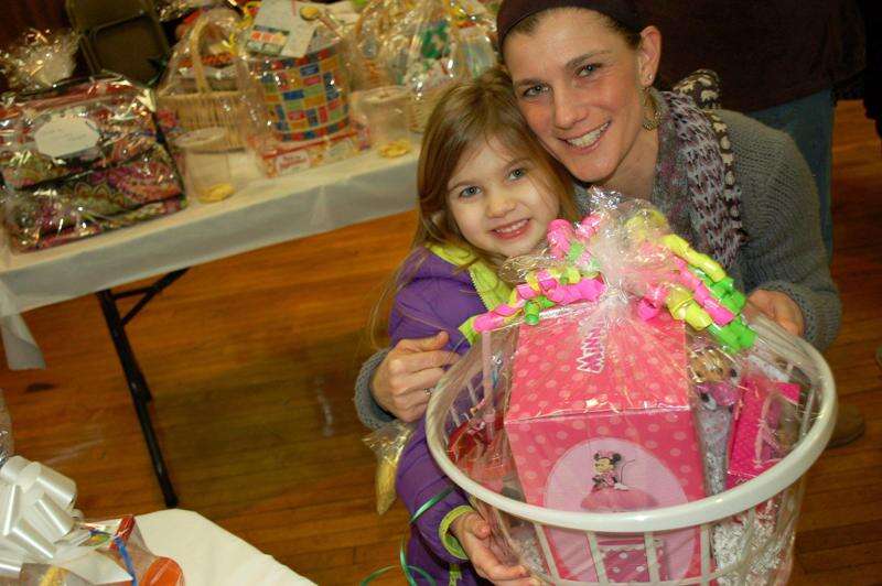 PRESS PHOTO BY AL RECKER Caitlin Grab, 5, has her eye on a gift wrapped basket of stuffed toys and other items kids love at the Tricky Tray at St. John's Catholic Church, Stiles. Caitlin's mother, Amy, of South Whitehall, hopes Caitlin's tickets are the winning numbers for the basket.