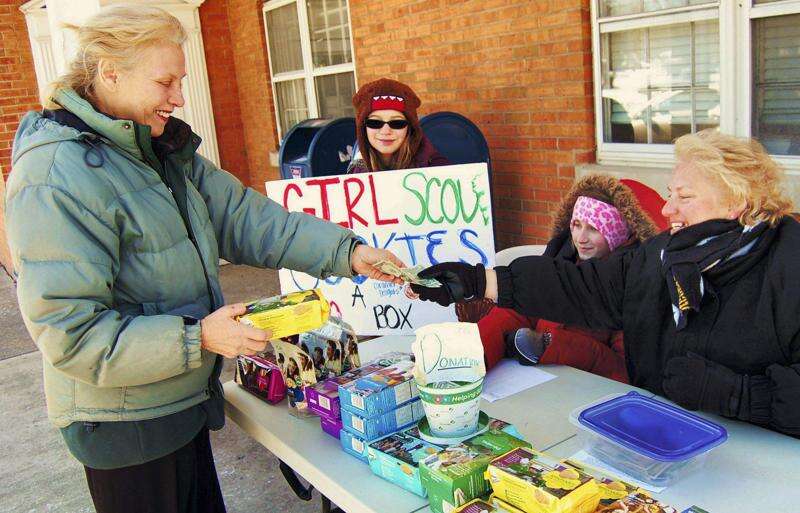 Press Photo by Tim Gilman Girl Scout cookie buyer Shelley Barchanowitz-Goldberg of Hellertown purchases more baked treats from Troop 8013 outside the Hellertown Post Office. Bundled up for the recent below-freezing spell of wintry weather are Girl Scouts Ava Kalember and Olivia Kacerik and their troop leader Natalie Faroun, who supervises cookie sales. She said there are nine different types of the popular baked treats this year, including a gluten-free variety, called Trios, which contain chocolate chips,