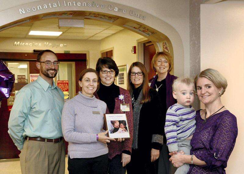 PRESS PHOTO COURTESY ST. LUKE'S HEALTH NETWORK Dad Tim Getz with Wendy Marraccini, family team specialist with the March of Dimes; Barbara Raab, RN, NICU family support specialist at St. Luke's, Bethlehem; Cindy Max, MSN, RN, VP operations, St. Luke's University Health Network; Patricia Gubich, RN, pediatrics and NICU patient care manager, St. Luke's, Bethlehem; and Brady Getz with mom Julie Getz celebrate the many infants cared for successfully in the NICUs. Brady is a St. Luke's NICU 'graduate.'