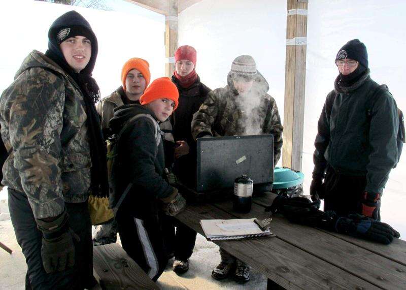 PRESS PHOTOS BY C. RICHARD CHARTRAND Boy Scouts gathered to practice their winter skills outdoors in the annual Klondike Derby Jan. 31 in Franko Farm Park, Salisbury Township. Skill stations were named for Ntional Football League teams and featured such challenges as an ice rescue, roping and learning techniques to help someone choking. Participating Scouts represented Boy Scout Troops from Alburtis, Old Zionsville, Emmaus, Salisbury and Allentown. ABOVE: Scouts from Boy Scout Troop 31, Old Zionsville, make