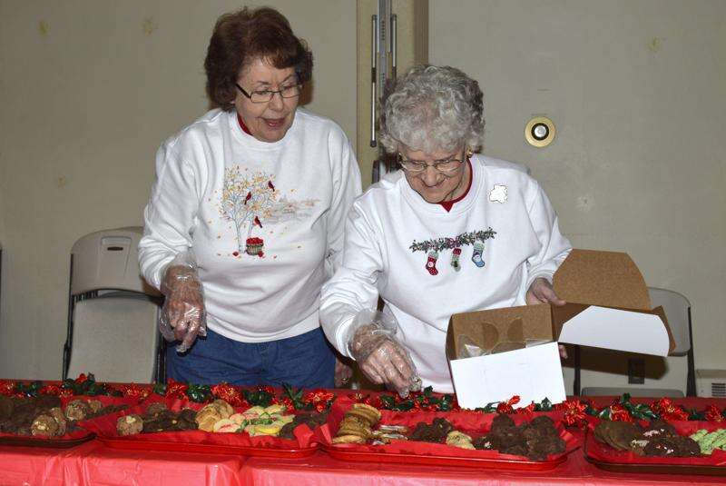 PRESS PHOTOS BY STACEY KOCH From left, Dorothy Clauser and Renae Yelles gather a box of cookies to be sold at Good Shepherd Lutheran Church's annual cookie sale and Christmas boutique event Dec. 13. 'All the cookies were gone by 10:15 a.m.,' Yelles said. The church is located in Kreidersville.