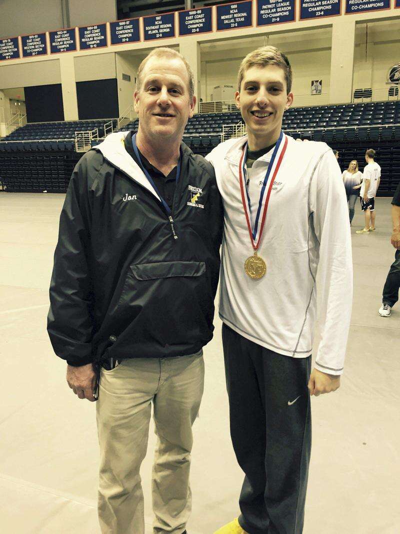 Contributed photo Sam Magnan, right, along with coach Jon Larson, shows his state gold medal from the 500 free race.