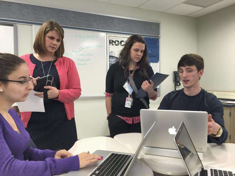 CONTRIBUTED PHOTOS Senior Danielle Bartolucci and xxxxxxxxxxxxxxxx demonstrate for visiting educators how they use the laptops at the high school level.