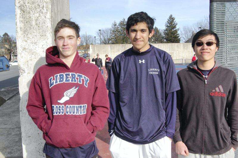 PRESS PHOTO BY KATIE MCDONALD Left to right, Liberty tennis players, Dan Lynn, Milind Jagota, and Julian Mark are the Hurricanes' singles players this year.