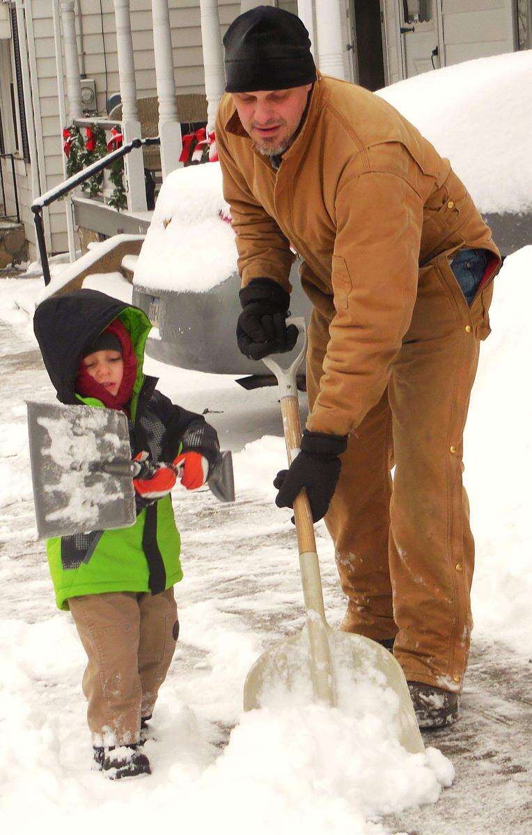 Shoveling crew of Gary Moll and his young neighbor Wesley Shilanskas clear a sidewalk along Center Steet in northeast Bethlehem after another recent snowstorm. The youngster had his own shovel provided by his father, John Shilanskas, who was several houses nearby taking care of their own property snow removal. Moll, a friend of the Shilanskas family who had already shoveled his own property, said 'I like to help out my neighbors with their snow-covered sidewalks.'