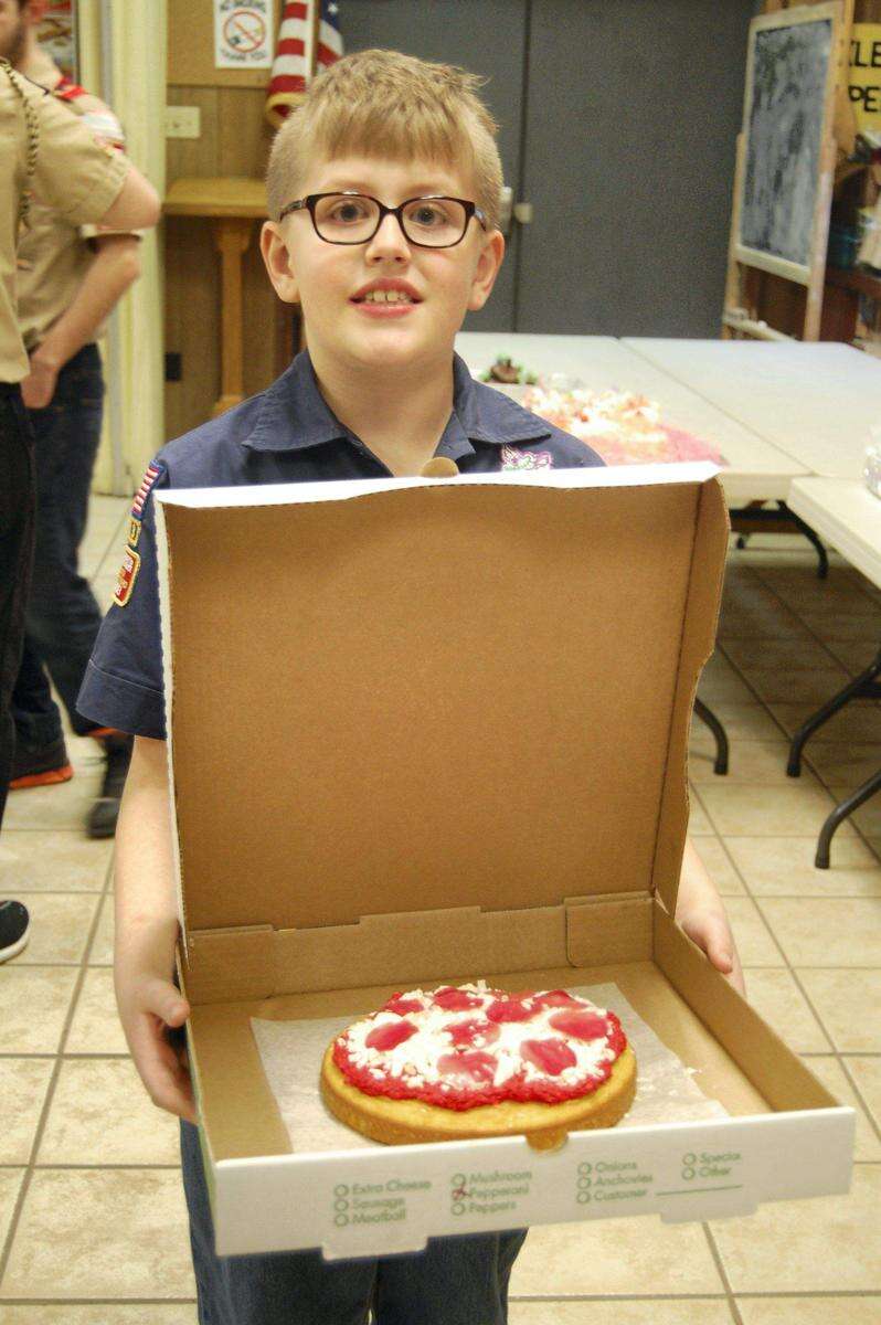 Tory Holdridge shows the pizza he made consisting of vanilla cake, red frosting, shaved white chocolate and fruit roll-ups.