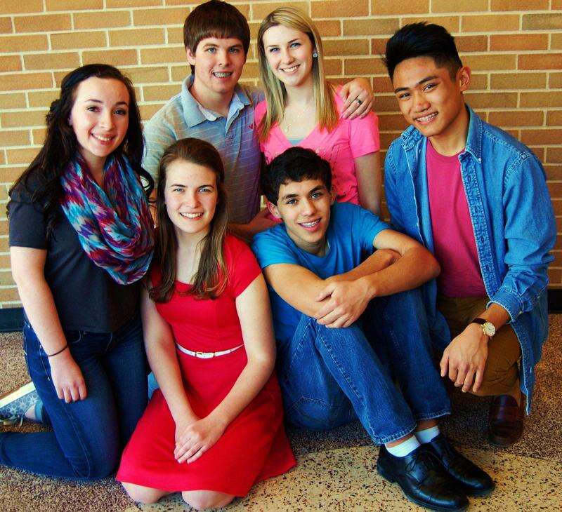 Whitehall High School 'How To Succeed In Business Without Really Trying' cast, from left, center: Emily Emick (Rosemary Pilkington) and Carmelo Santiago (J. Pierrepoint Finch), and back, Taylor DeFranco (Smitty), Kris Hobel (J.B. Biggely), Lauren Williams (Hedy LaRue) and Marvin Manalo (Bud Frump).