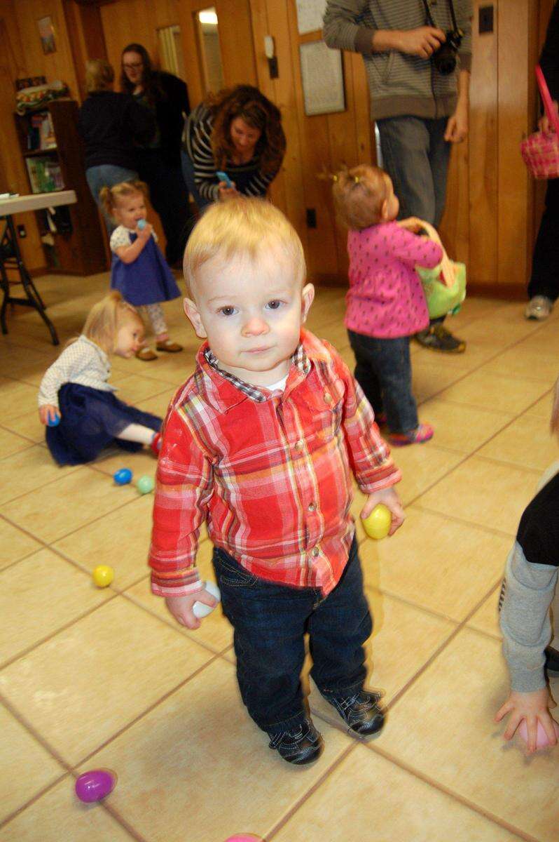 Spencer Nash finds an egg during the hunt for children ages 0 to three. The hunt for the youngest children was held indoors due to the chilly weather.