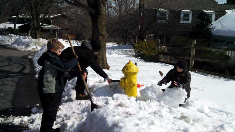 Boy Scouts and Cub Scouts from Troop 5 and Pack 5 clear fire hydrants after a recent snow. Township residents are reminded to clear snow from hydrants near their homes and in their neighborhoods.