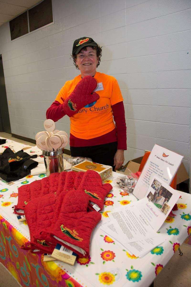 PRESS PHOTOS BY LOU WHEELAND Selling cook-off keepsakes at the Asbury Chili Cook-off is Susan Berry of Upper Macungie. Proceeds will help to refurbish and expand the playground for 900-plus students at Ramos Elementary School in the Allentown School District.