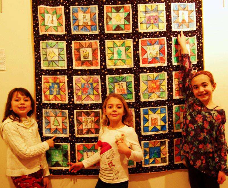 1027 Second graders from Moravian Academy Tessa Francis, Emily Reynolds and Angelina Perruci stand in front of the a contemporary quilt hanging on a wall as a special part of the Stars of Bethlehem Quilt Exhibition at the Kemmerer Museum which continues through April 5. The girls are among 39 second graders who colored individual star squares with a personal illustration of what Bethlehem meant to each of them. The completed cloth square pieces were then quilted together on a background fabric by Beth
