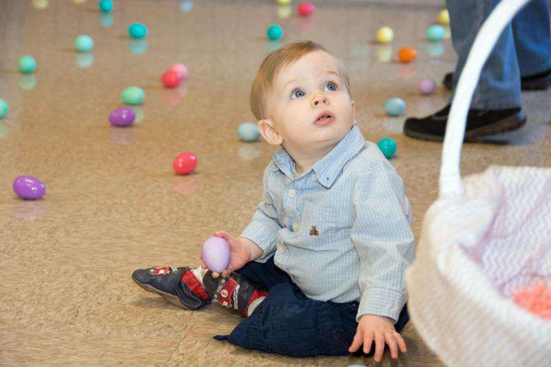 Milo, 9 months, son of Laura and Erik Lentz of South Whitehall, isn't quite sure what to do with all the eggs surrounding him at Coopechan Fish and Game Club's annual Easter egg hunt March 29 in North Whitehall. PRESS PHOTO BY LOU WHEELAND