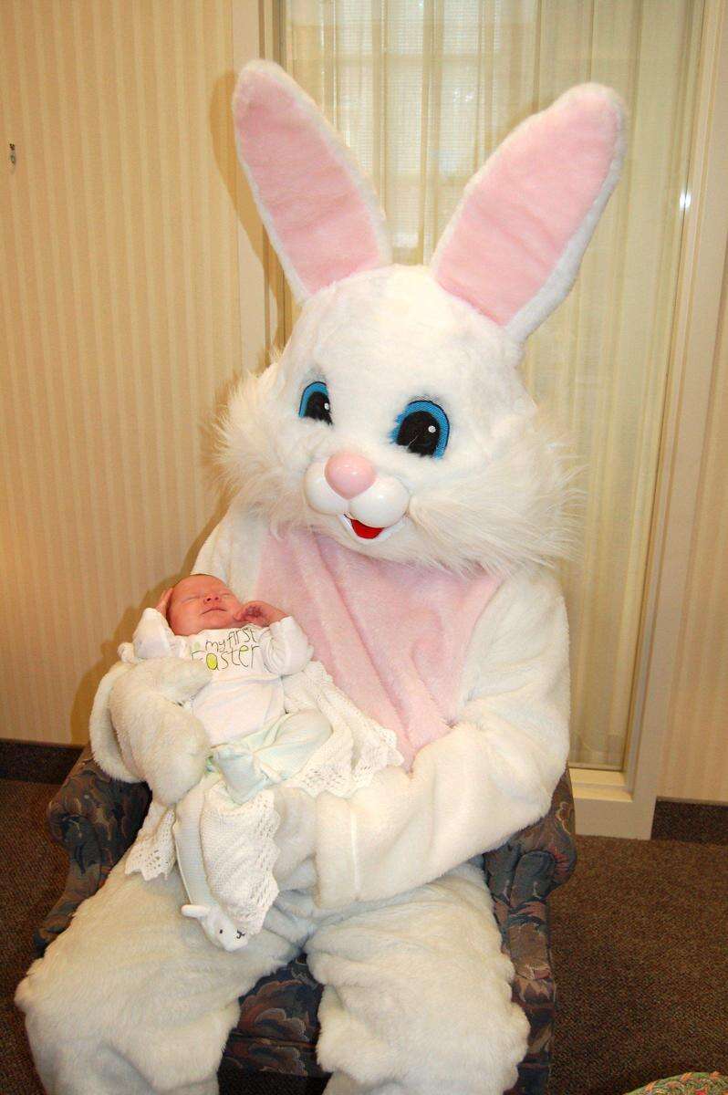 Piper Reeve, 5 weeks, of Slatington, visits with the Easter Bunny for her first time April 3 as part of the Community Banking Month celebration at The Neffs National Bank, Neffs. PRESS PHOTO BY SUSAN BRYANT