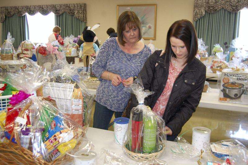 PRESS PHOTOS BY SUSAN BRYANT Patti Brosky of Laurys Station and Lauren Brosky of Whitehall check out a basket of salon products raffled off at the Auxiliary of Northern Valley Ambulance spring bazaar April 11 in Ormrod.