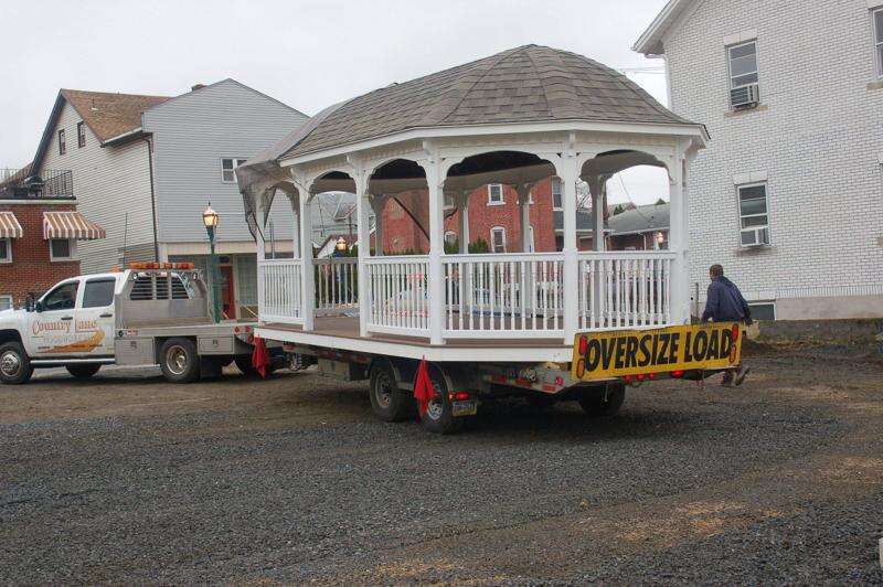 The white-trimmed gazebo, topped with a decorative steeple, was transported from Lancaster to the Main Street site recently.